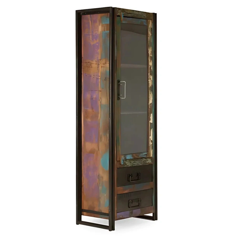 Tato neotřelá vitrína je vyrobena z recyklovaného tvrdého dřeva, pravděpodobně teakového, což jí dodává jedinečný charakter a ekologický aspekt. Její starožitné provedení s barevnými plochami a detaily v černo-barevné kombinaci zaujme na první pohled. Skleněné dveře umožňují vystavit vaše oblíbené předměty, zatímco dvě praktické zásuvky poskytují skrytý úložný prostor. Robustní kovový rám zajišťuje stabilitu a industriální vzhled.